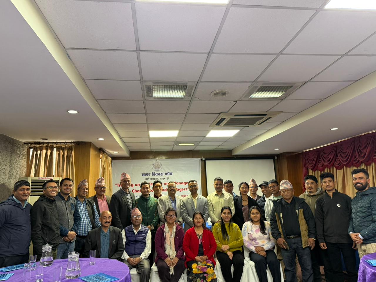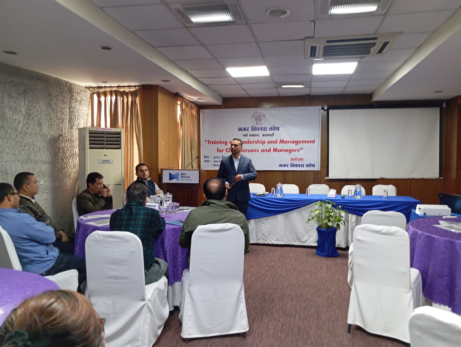 नगर विकास कोषको आयोजनामा खानेपानी तथा सरसफाइ उपभोक्ता समितिहरूको संस्थागत क्षमता अभिवृद्धि गर्ने उद्देश्यले  Leadership and Management to chairpersons and managers” सम्बन्धी तालिम काठमाण्डौमा मिति: २०८२-१२-८ देखि २०८२-१२-१० सम्पन्न गरिएको छ । यसबाट खानेपानी उपभोक्त्ता संस्थाहरुको नेतृत्व, व्यवस्थापन क्षमता, सेवा सञ्चालन सुधार तथा संस्थागत सुदृढीकरण हुने अपेक्षा गरिएको छ । यस गोष्ठीमा Dhadikot Sahari Khanepani, Manpang Khola Salyantar Khanepani, Gothatar Bhaimal Khanepani, Dhading Tripurasundari-2 Khanepani, Katari Bazar Naya Khanepani, Letang Khanepani, Dachhi Bhadrabas Sahari Khanepani, Tankisinwari Khanepani, Saptakoshi Sahari Khanepani, Chhap Nahala Khanepani, Bhadgaun Khanepani, Anboo Khaireni Khanepani, Besi Sahar Khanepani, Khairenitar Khanepani, Lamki Khanepani, Kohalpur Brihat Sahari Khanepani, Baglung Urban Drinking Water Users Organization, Sunkoshi Panchkhal Drinking Water, Meghauli Small Town Water Supply र Lamahi Khanepani - Dang खानेपानी तथा सरसफाई उपभोक्ता संस्थाहरूका अध्यक्षज्यू, व्यवस्थापकज्यू एवम् उपभोक्ता संस्थाका प्रतिनिधिज्यूहरूको सक्रिय सहभागिता रहेको थियो।
